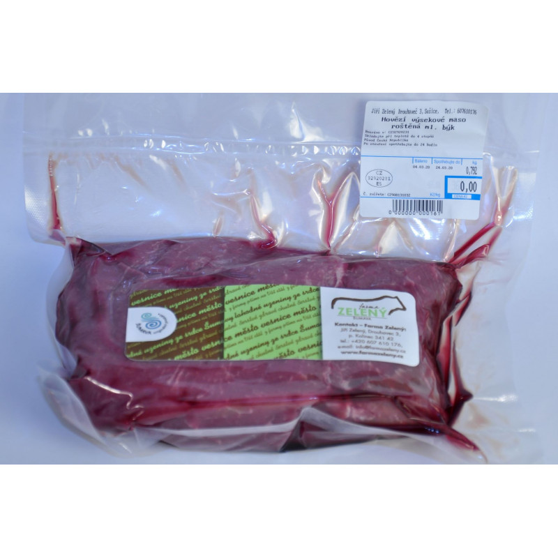 Hovězí maso z vlastního chovu farmy Zelený z Drouhavče. Maso je po porážce zchlazeno a po desetidenním zrání rozbouráno a vakuově zabaleno.