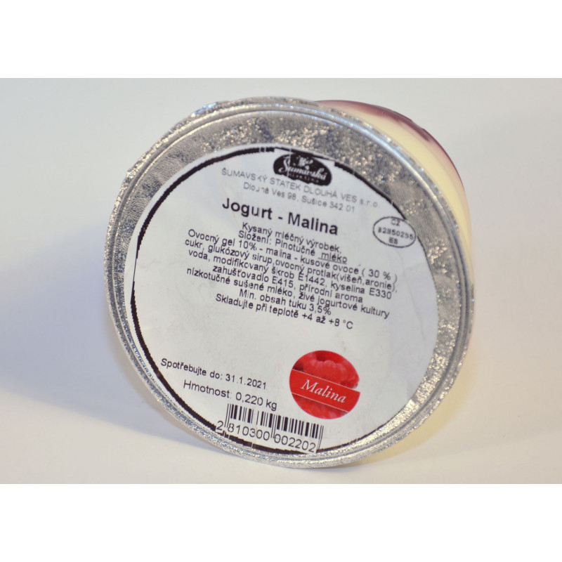 Poctivý plnotučný jogurt s malinami z kravského mléka od krav pasoucích se na šumavských loukách.