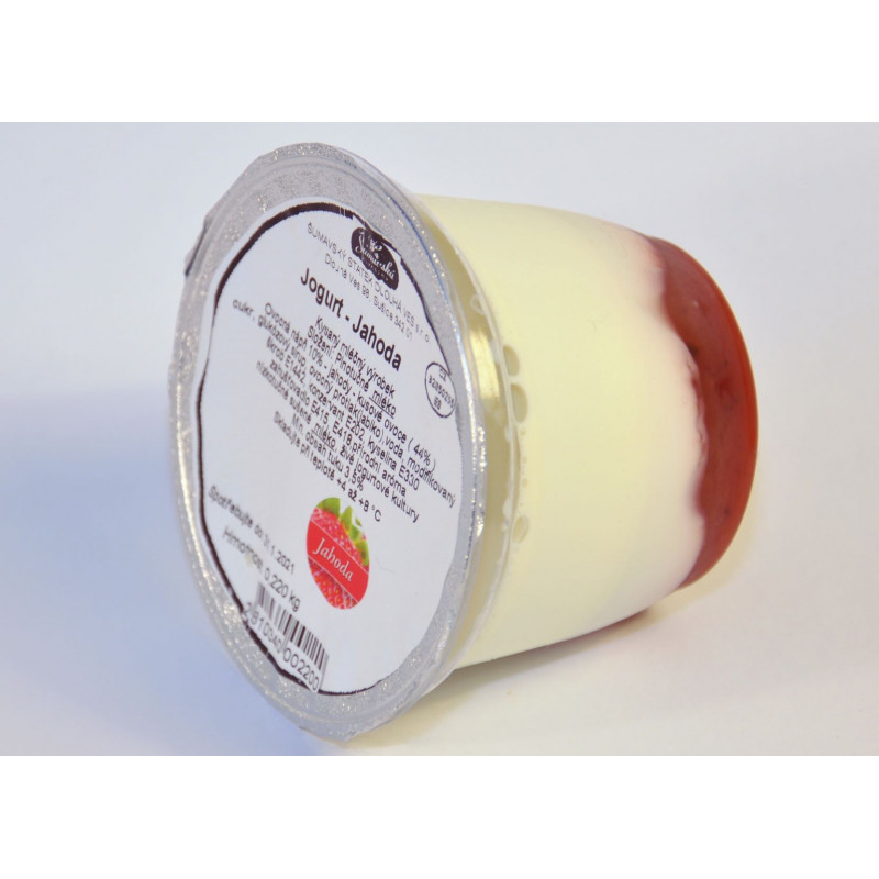 Plnotučný smetanový jogurt s příchutí jahod.
