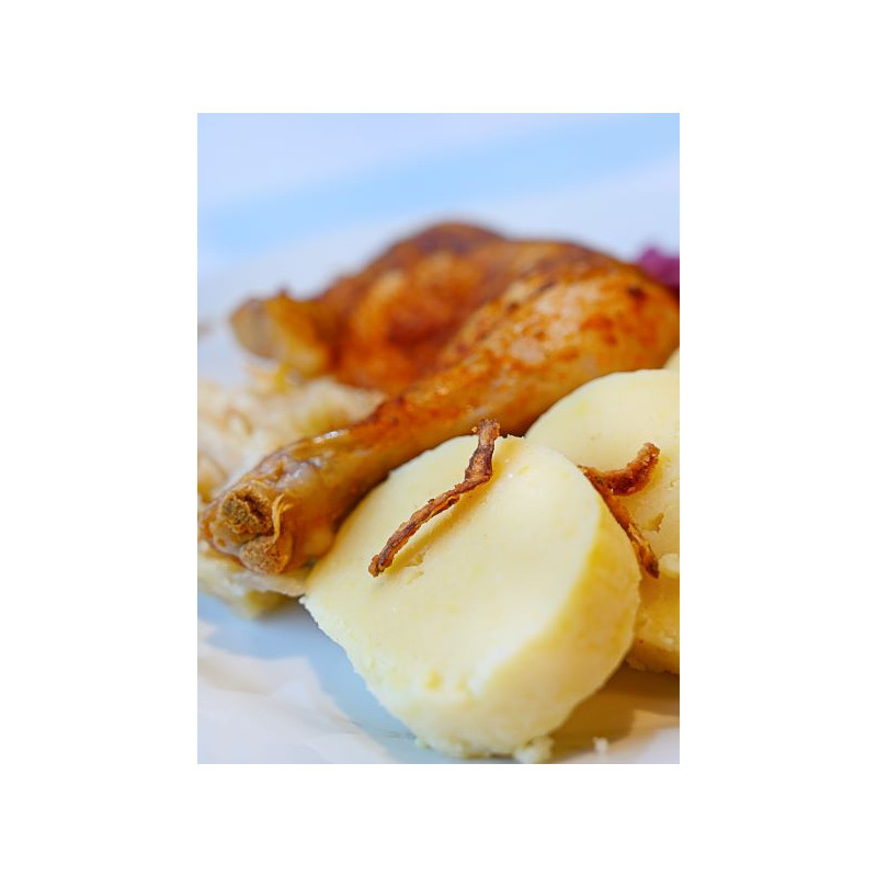 Tyto knedlíky se vyrábíme z pečlivě vybíraných odrůd brambor, nejsou vyráběny z žádných polotovarů ani směsí. Přípravu bramborového těsta i vaření provádíme dodržováním tradičních postupů, které společně se 100% ruční prací při výrobě, dodává našemu bramborovému knedlíku exkluzivní chuťové vlastnosti, připomínající společné chvíle u rodinného stolu.