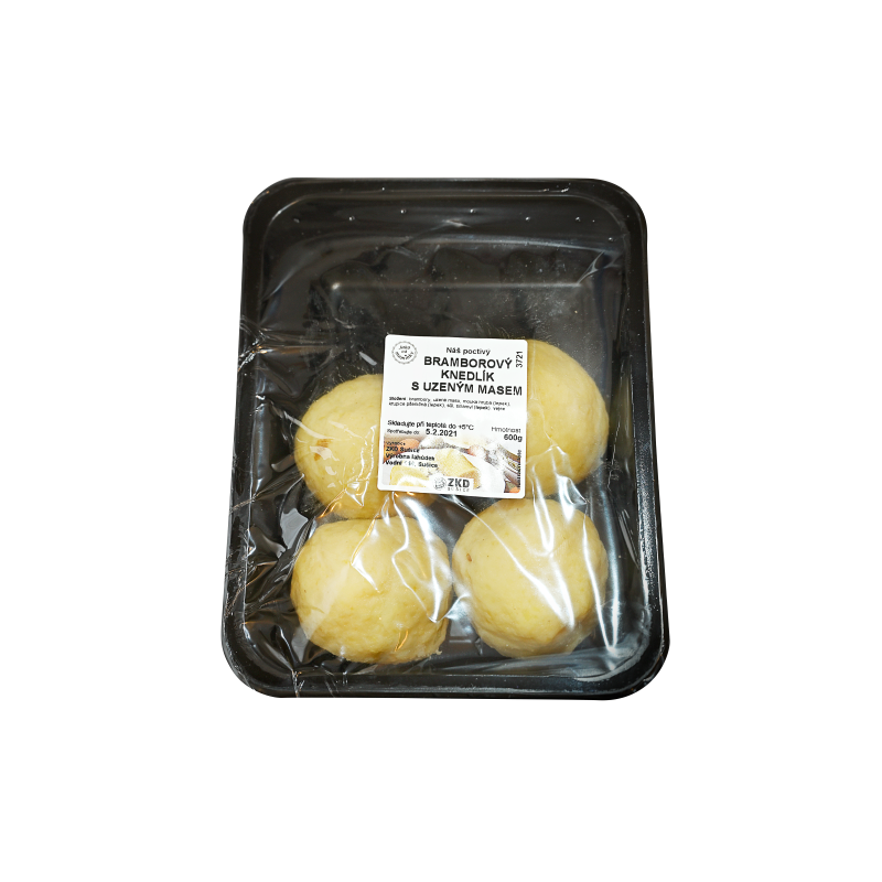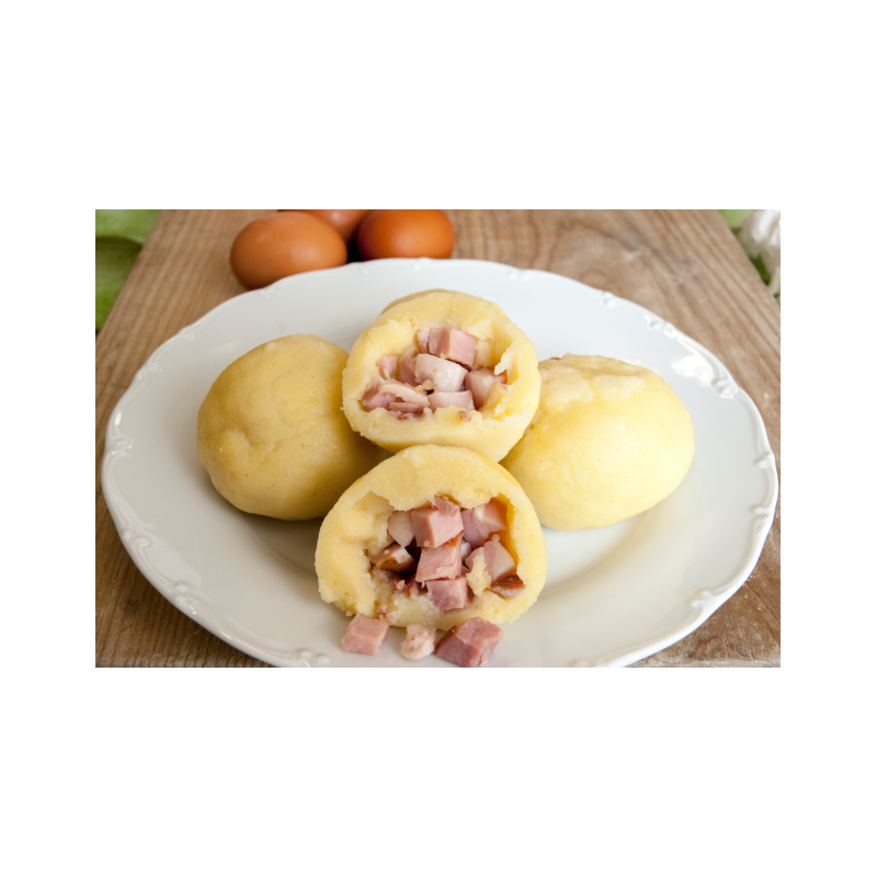 Tyto knedlíky vyrábíme z pečlivě vybíraných odrůd brambor a kvalitního uzeného masa. Příprava surovin, plnění i vaření provádíme dodržováním tradičních postupů, které společně se 100% ruční prací při výrobě, dodává našemu knedlíku exkluzivní chuťové vlastnosti, připomínající společné chvíle u rodinného stolu.