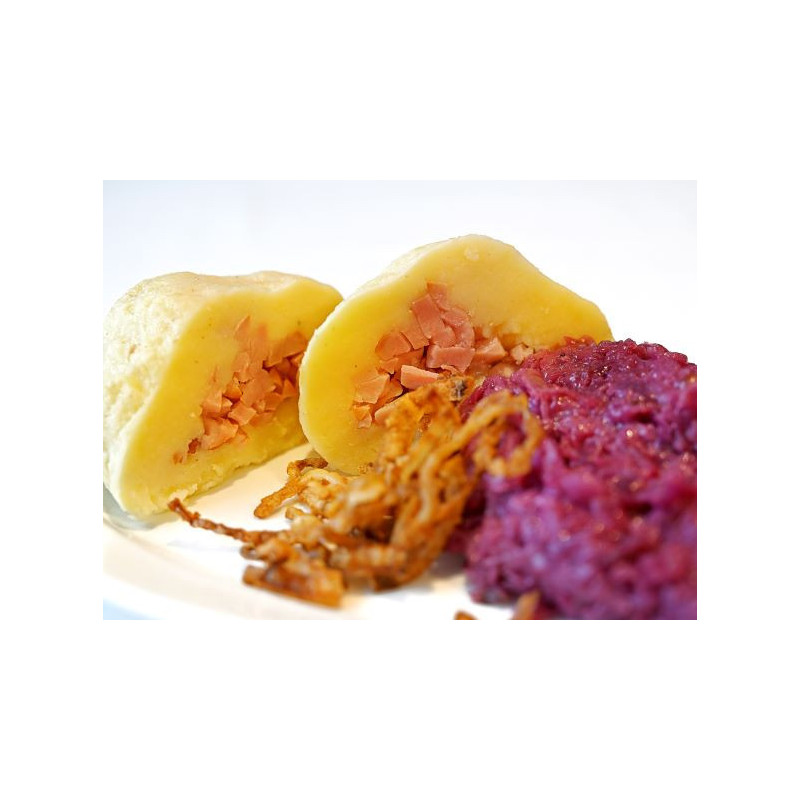 Knedlíky jsou plněny krájenými celými kousky kvalitního uzeného masa a bramborové těsto je připravené a vařené ze surových brambor.