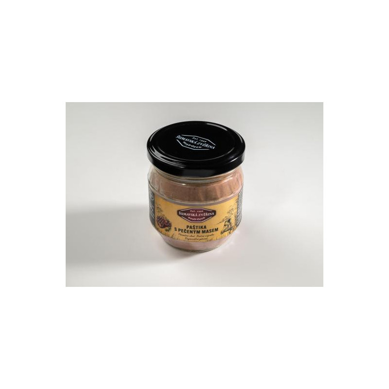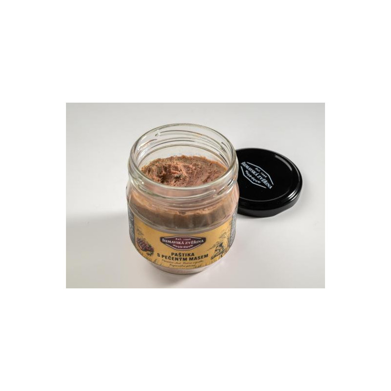 Paštika s obsahem pečeného masa z divokého prasete, včetně výpeku a vývaru, vepřového masa, jater a medvědího česneku.