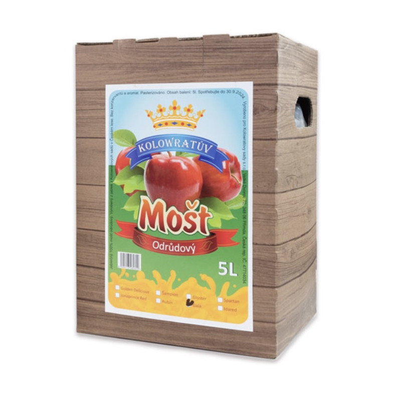 Kolowratův mošt z jablek z vlastních sadů. 100% ovocný, šetrně pasterovaný, balený v praktickém 5l bag-in-boxu s kohoutkem.