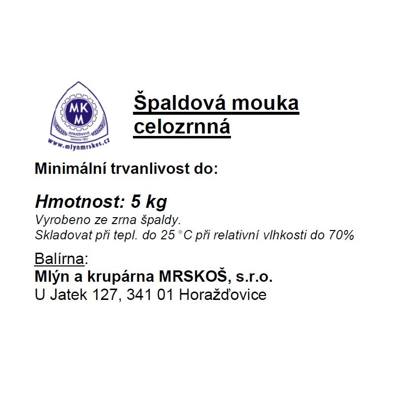 Šumavská špaldová hladká celozrnná mouka z rodinného mlýna Mrskoš oceněná značkou Šumava originální produkt.