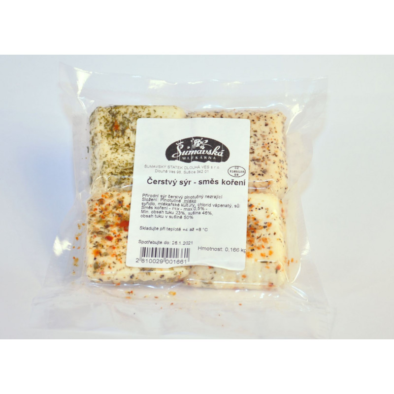 Čerstvý nezrající sýr okořeněný směsí koření. Zpracované mléko pochází od krav pasoucích se na šumavských loukách v okolí Dlouhé Vsi.