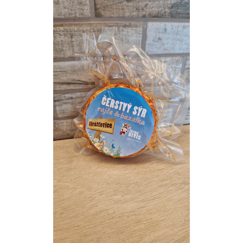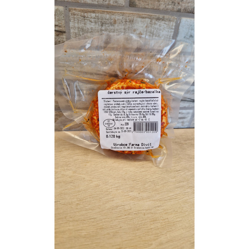 Čerstvý sýr s příchutí rajčat a bazalky z rodinné farmy Diviš. Balení cca 100 g.