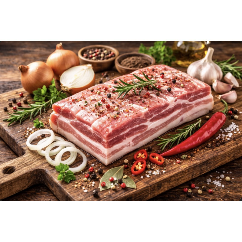 Vepřový bůček bez kosti je šťavnatý kus masa s přirozeným mramorováním, který patří mezi nejoblíbenější části vepřového. Díky optimálnímu poměru masa a tuku zůstává při tepelné úpravě měkký, aromatický a plný chuti.